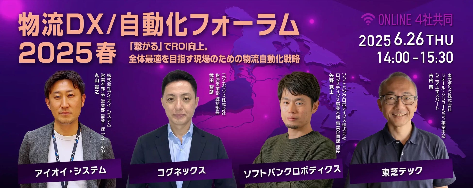 ソフトバンクロボティクス株式会社(本社:東京都港区、代表取締役社長 兼 CEO:冨澤 文秀)は、株式会社アイオイ・システム(本社:東京都品川区、代表取締役社長:吉野 豊)、コグネックス株式会社(本社:東京都文京区、代表取締役社長:ロバート・ウィレット)、東芝テック株式会社(本社:東京都品川区、代表取締役社長:錦織 弘信)と「物流DX/自動化フォーラム 2025春」を2025年6月26日(木)に共催します。