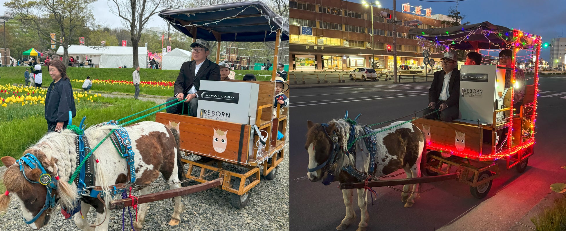 5月24日に開催された「第51回くしろチューリップ&花フェア」にて、EVバッテリーを電源としたイルミネーションを花馬車に装飾し、運行させるというユニークな試みを行いました。