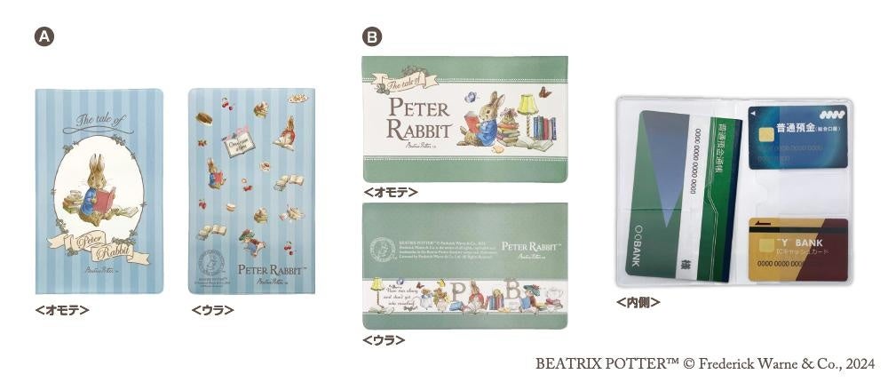 読書を楽しむ「ピーターラビット™」たちと、お菓子や本などのアートが華やかなデザインを使用したグッズです。「トートバッグ」「ロングポーチ」「通帳ケース(2種)」「ダイカットメモセット」の5アイテムです。