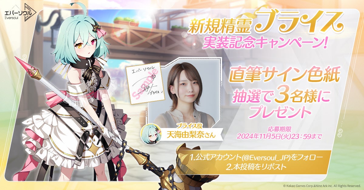 新規精霊「ブライス」の実装を記念して2024年10月23日(水)より「フォロー&リポストキャンペーン」を実施中です。『エバーソウル』公式X(旧Twitter)を フォローした状態で、該当キャンペーンポストをリポストした方の中から「ブライス」役を演じた「声優:天海由梨奈さん」の直筆サイン色紙を抽選で3名様にプレゼントします!