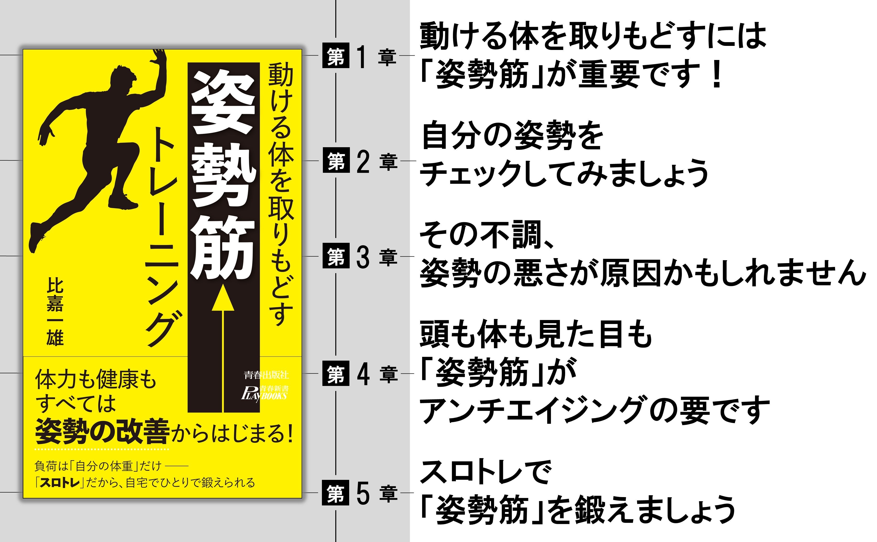 本書では、若々しく元気でいるために姿勢筋がいかに大切かを紹介しながら、効果的な姿勢筋トレーニングを紹介します。