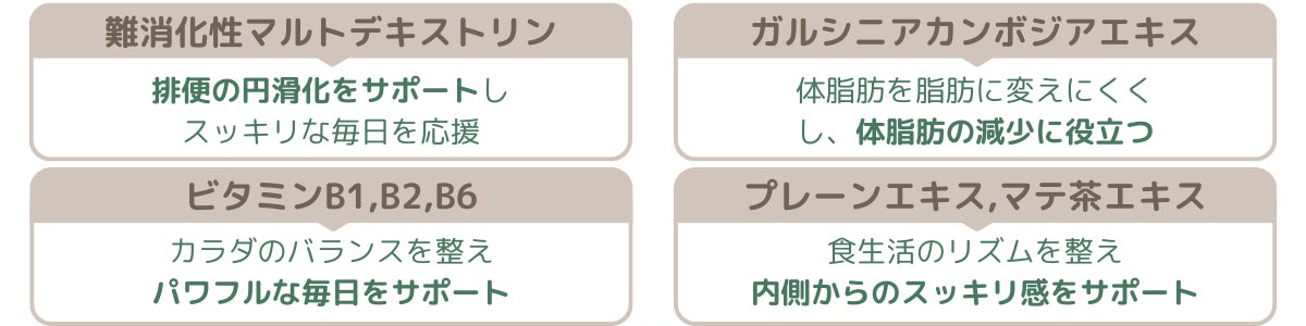 さらに、排便の円滑化を助ける「プルーンエキス」や、食生活のリズムを整える「マテ茶エキス」など、自然由来成分をバランスよく配合。