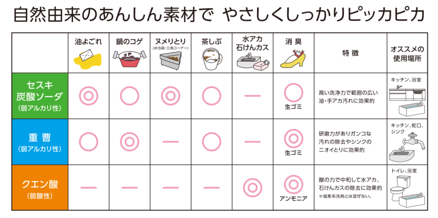 用途に応じた自然由来の洗浄成分(セスキ炭酸ソーダ・重曹・クエン酸)で家中きれいに