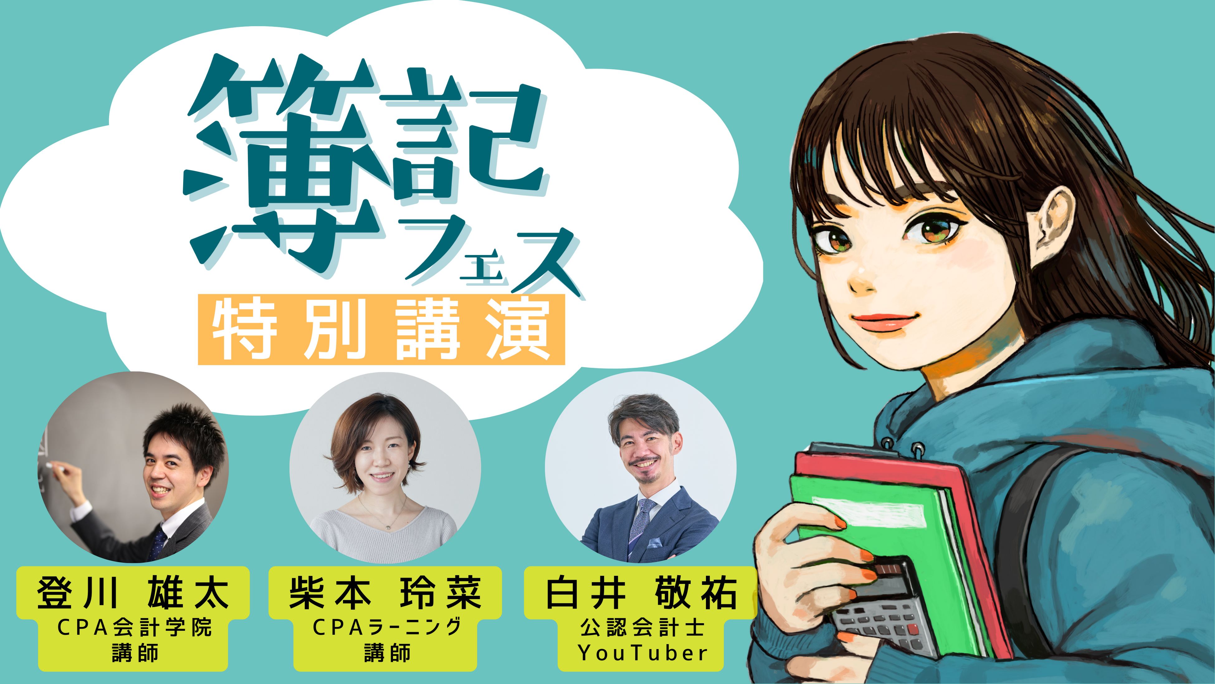 登壇者は、CPA会計学院の人気講師「登川雄太」、CPAラーニングで人気の簿記講師「柴本玲菜」、公認会計士YouTuberとして話題の「白井敬祐」です。