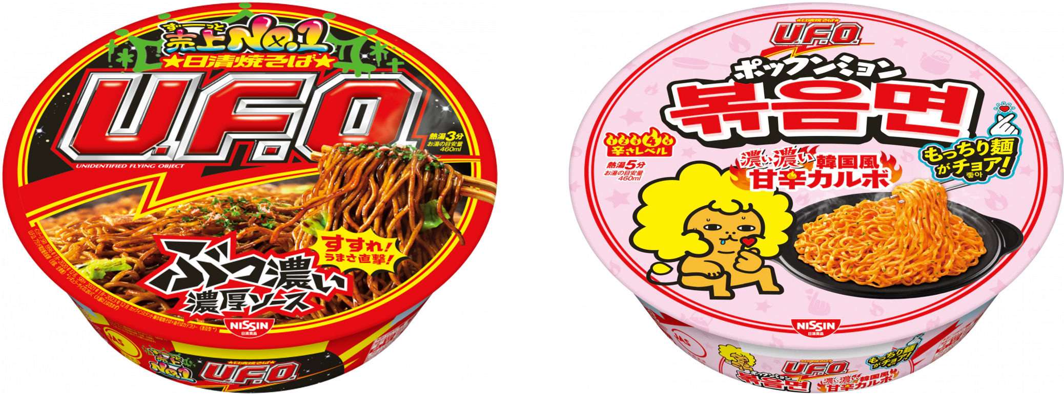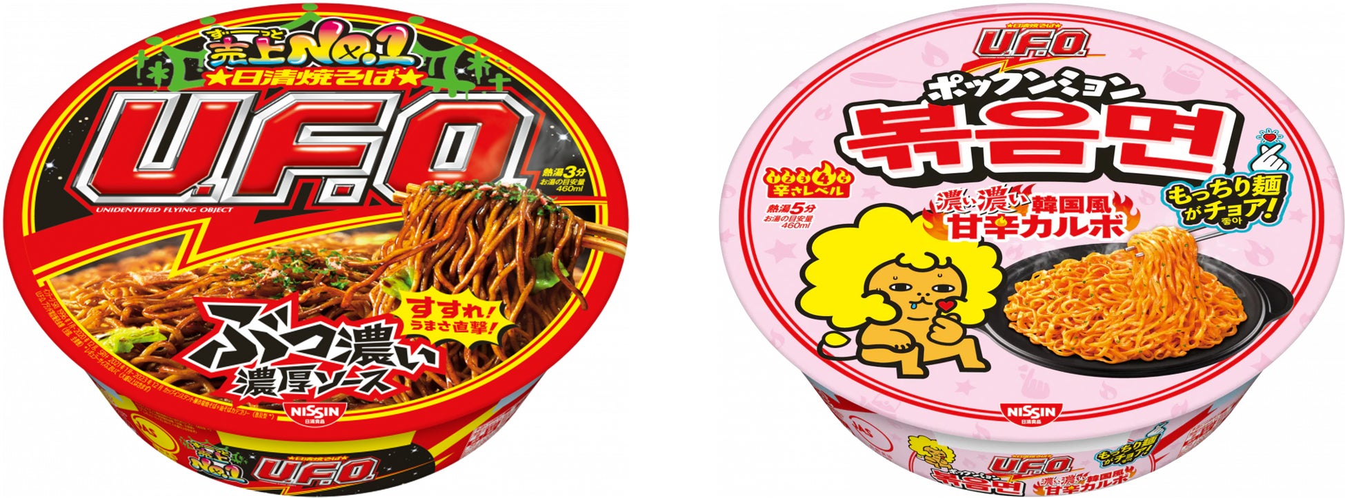 「日清焼そばU.F.O.」すすれ! うまさ直撃! ぶっ濃い濃厚ソース/「日清焼そばU.F.O.」ポックンミョン 濃い濃い韓国風甘辛カルボ