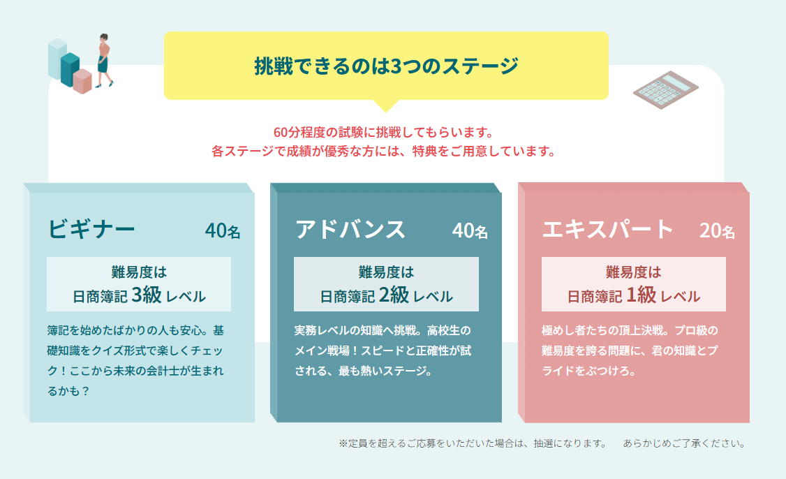 簿記は難しそう、とっつきにくいというイメージを持つ方も多いと思います。でもやってみると、面白い。ニュースや、企業の見方もすこし変わる。そんな体験をしていただきたいと思っています。簿記検定がいわゆる「試験」であるのに対し、このイベントは、試験、講演、クイズ大会など、「学び、出会い、気づき」の場です。