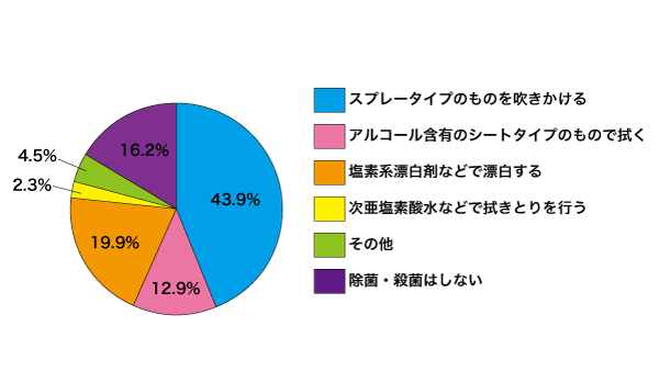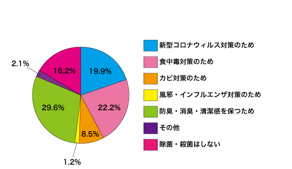 また「新型コロナウィルス対策のため」と答えた方が約2割と、コロナウイルス感染拡大がきっかけで除菌・殺菌をするようになった方もいらっしゃいました。