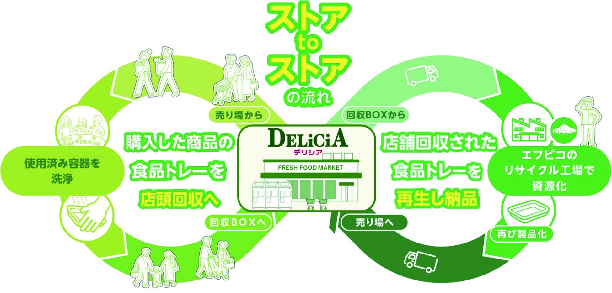 エフピコとデリシアの両社は、『お店が地域のエコリーダー』となる事を目指し、地域の環境負荷軽減、リサイクル資源の有効活用を積極的に行い、持続可能な循環型社会の推進に貢献してまいります。