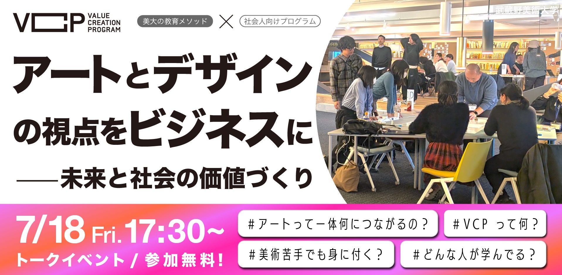 武蔵野美術大学によるアート&デザイン教育から「創造的思考力」を獲得し、ビジネスへの実践方法を学ぶ履修証明プログラム「価値創造人材育成プログラム-Value Creation Program」シリーズについて知ることができるイベントです。