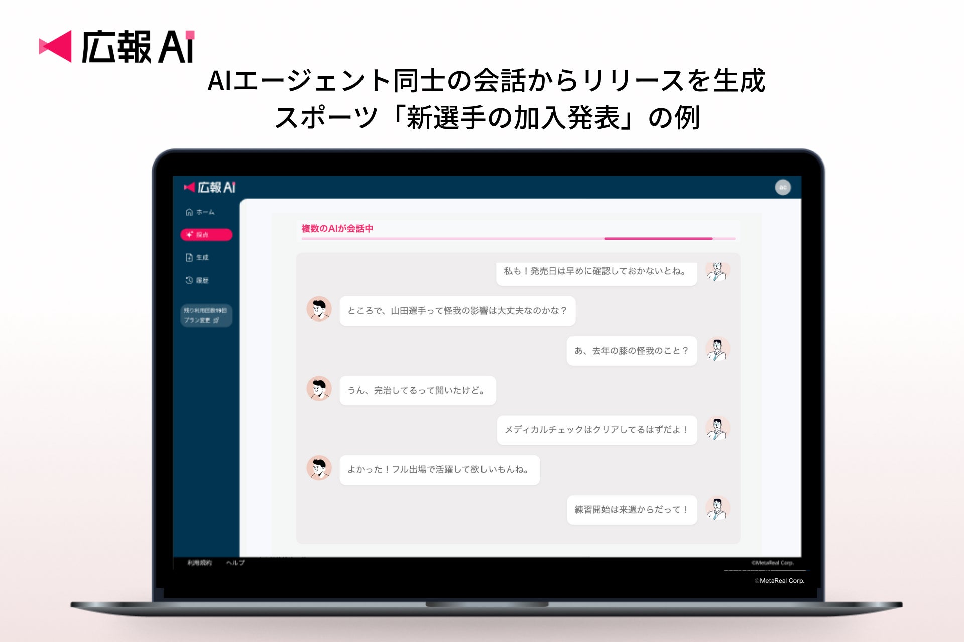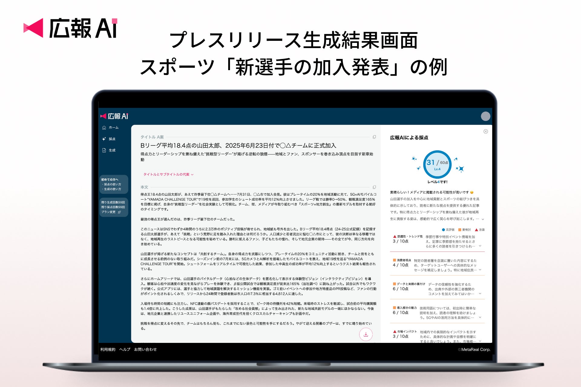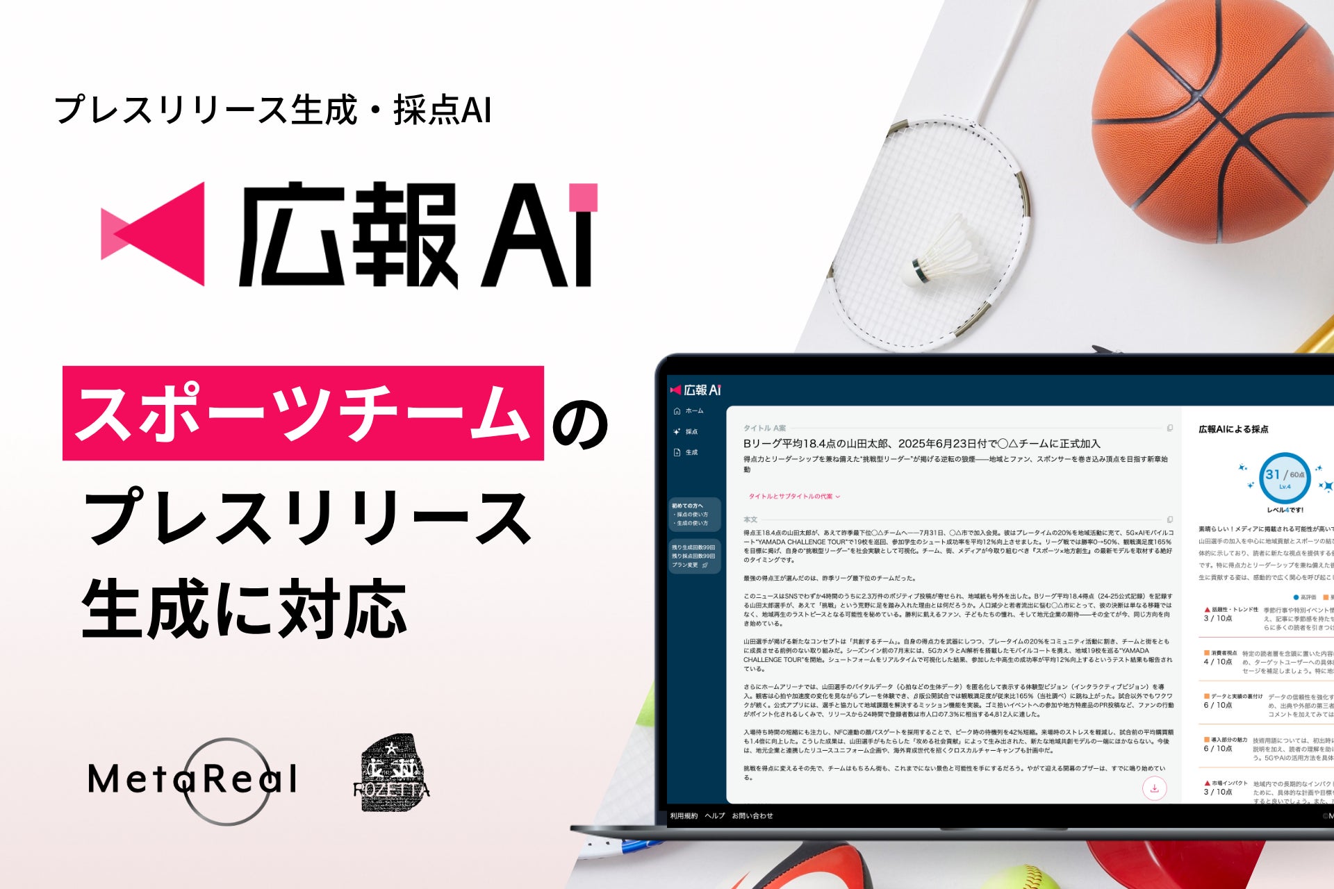 業種特化の専門AI開発・運営を行うメタリアル・グループの株式会社ロゼッタ(本社:東京都千代田区、代表取締役:五石 順一)が提供する、メディアに掲載されやすいプレスリリースを生成・採点可能な『広報AI』が、スポーツチームのプレスリリース作成に対応しました。選手加入やイベント告知などの定型情報を、ファンやメディアに響くストーリー性ある記事に再構成し、広報業務の効率化と情報の魅力的な発信を支援します。