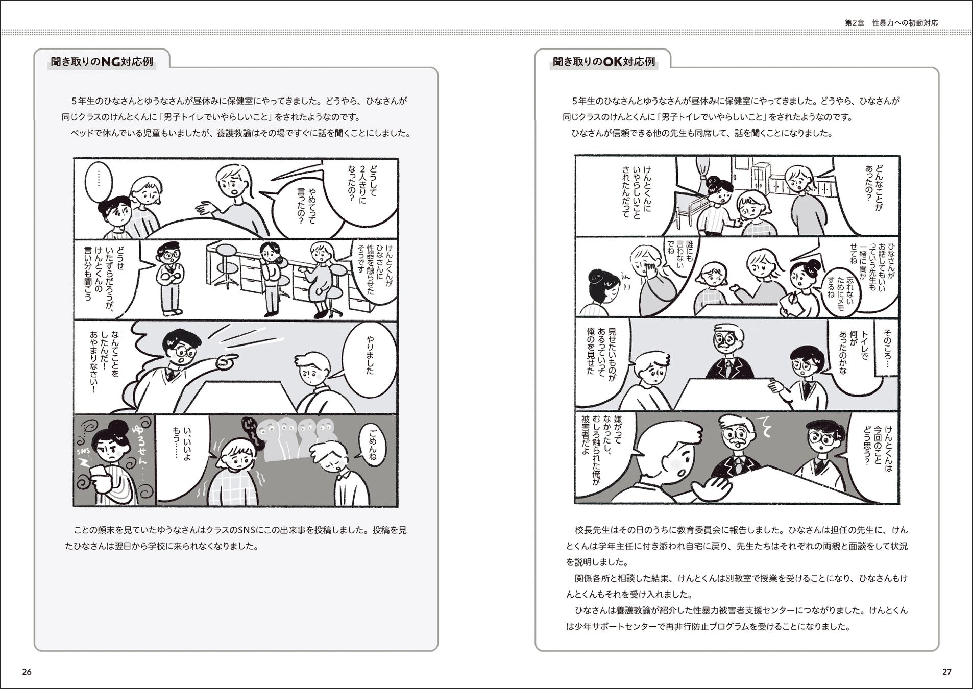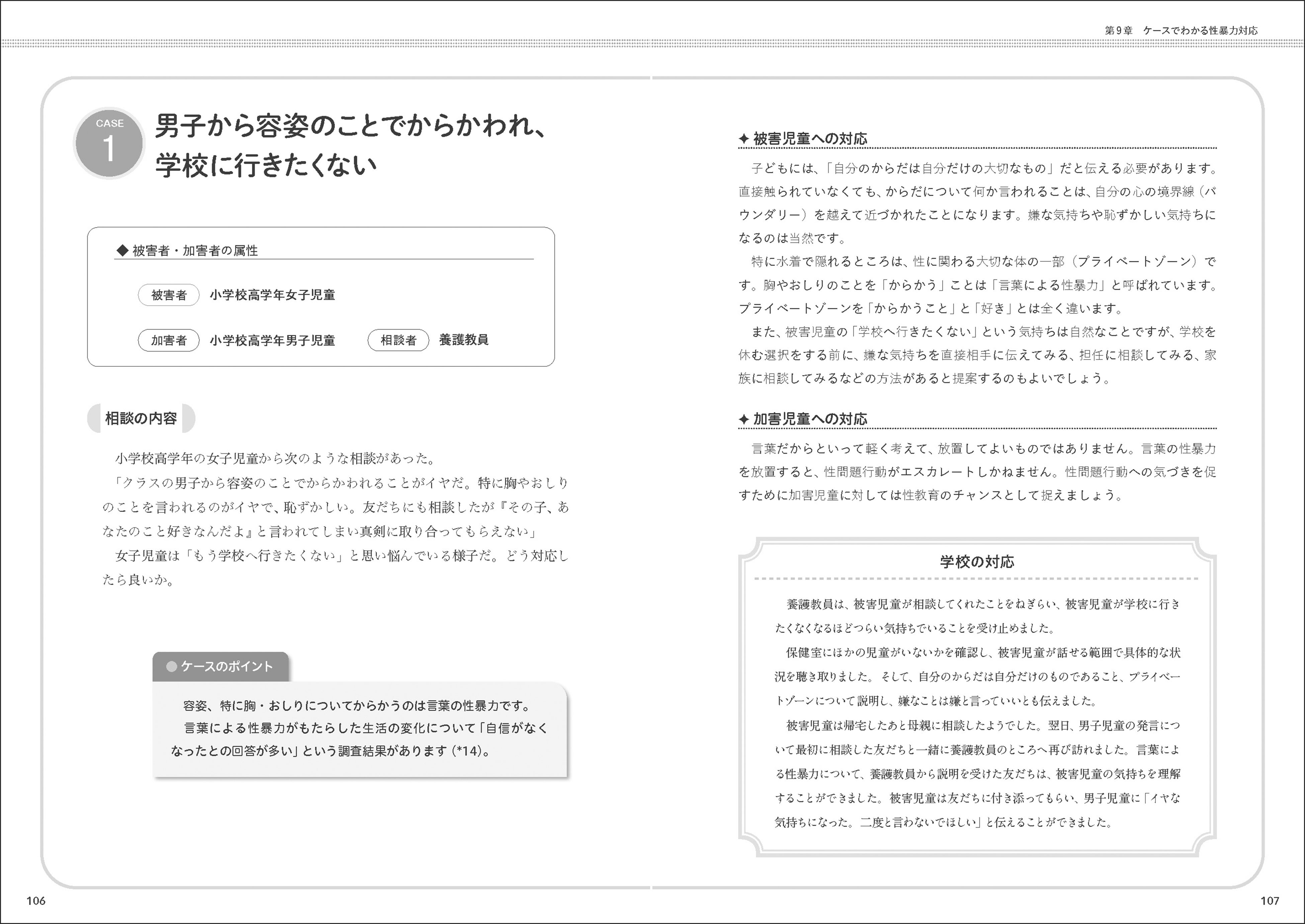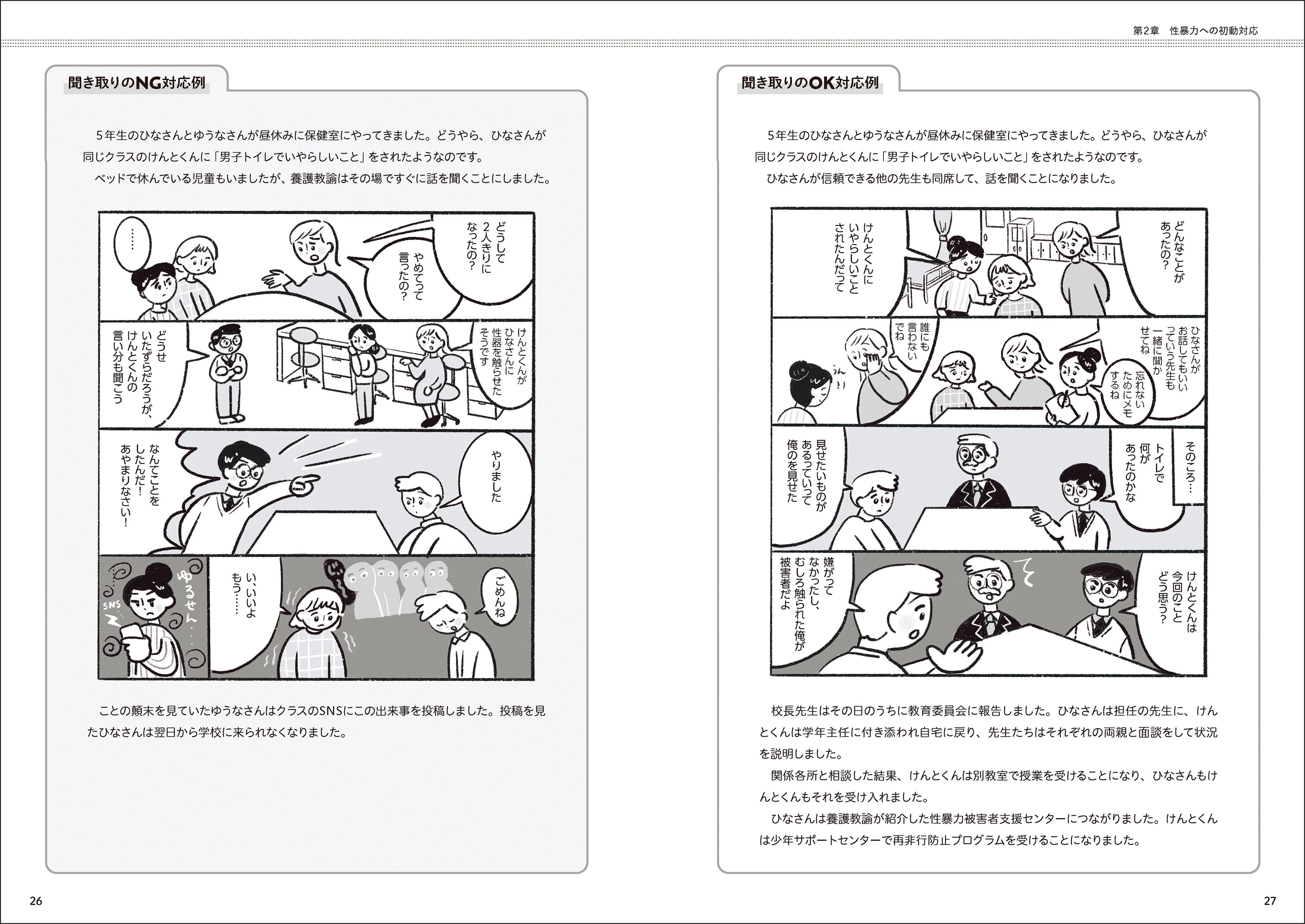 本書では、誰でもすぐに実践できる性暴力対応をはじめ、被害児童生徒の傷つきに寄り添うケア、性問題行動が見られる児童生徒への再発防止支援、性暴力を起こさない学校づくりのアイデアなど、緊急対応から予防まで丁寧に解説しました。
