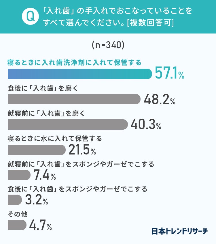 57.1%の方が「寝るときに入れ歯洗浄剤に入れて保管する」ようです。