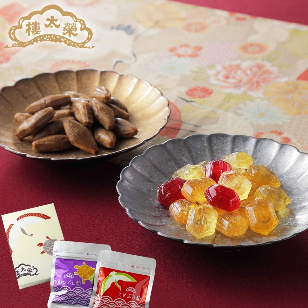 梅ぼ志飴をおめでたい亀甲形の「ことぶき飴」に、黒飴を縁起のよい鰹節形の「かつぶし飴」をセットにした贈り物などに最適な商品です。