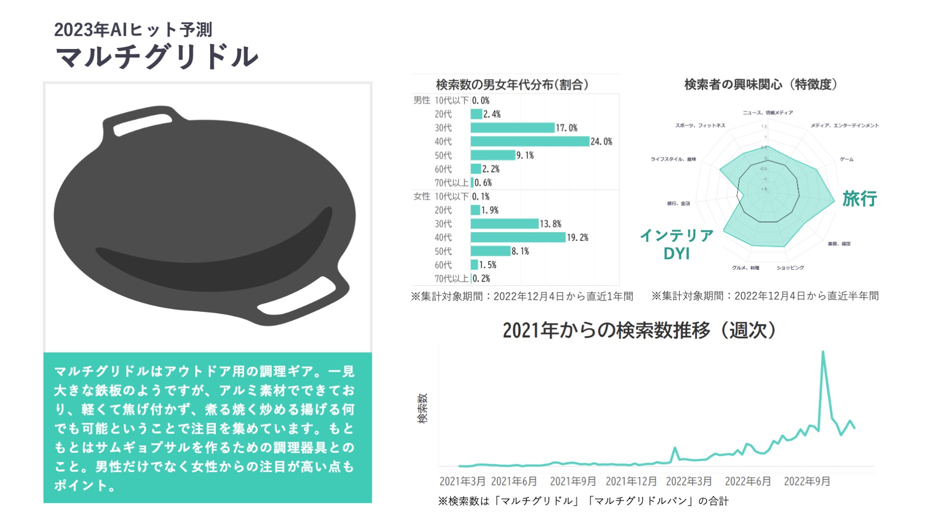 主にアウトドア用の調理器具で、一つで焼く・炒める・煮る・揚げるなどさまざまな調理ができる点が注目を集めています。男性・女性ともに関心が高い傾向にあります。