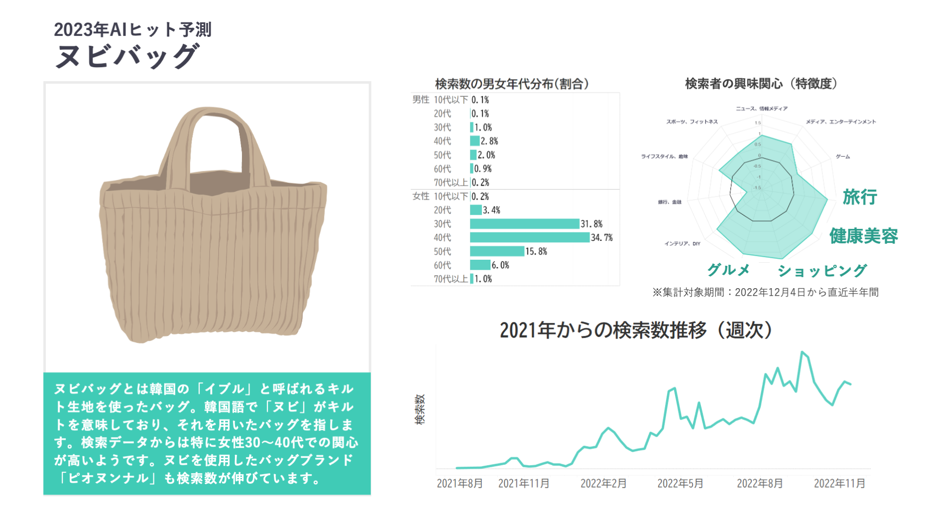 韓国の「イブル」と呼ばれるキルト生地を使ったバッグ。韓国語で「ヌビ」がキルトを意味しており、ヌビを用いたバッグ=ヌビバッグと呼ばれています。検索データからは、30~40代女性の関心が高い傾向にあります。
