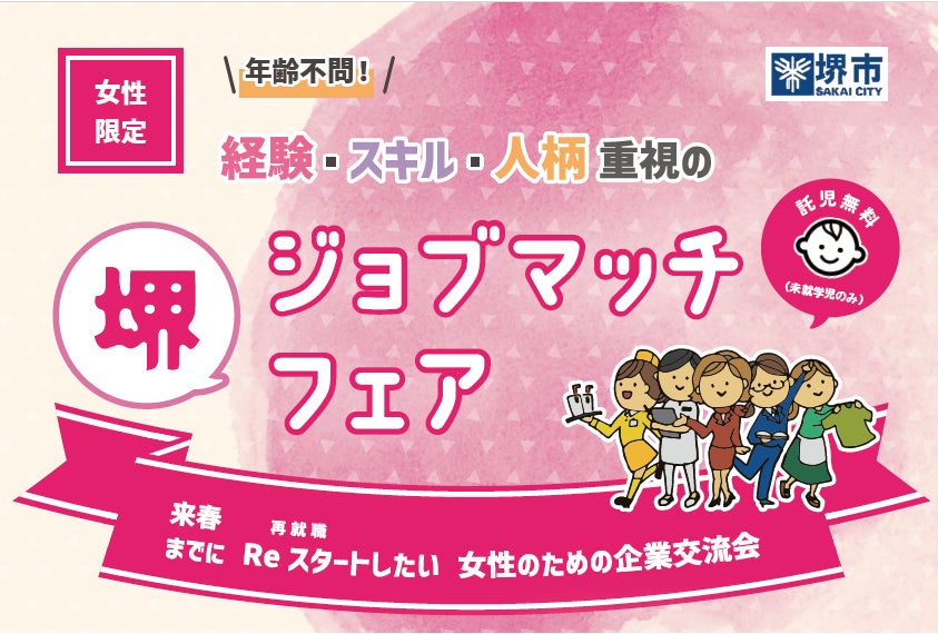 堺市では、女性の雇用促進を図るため、さかいJOBステーション主催の「堺ジョブマッチフェア」を開催します。女性の採用に積極的な企業10社が参加。年齢不問、人柄重視の女性限定の企業交流会です。参加無料、服装自由、入退場自由となっていますので、お気軽にご参加ください。