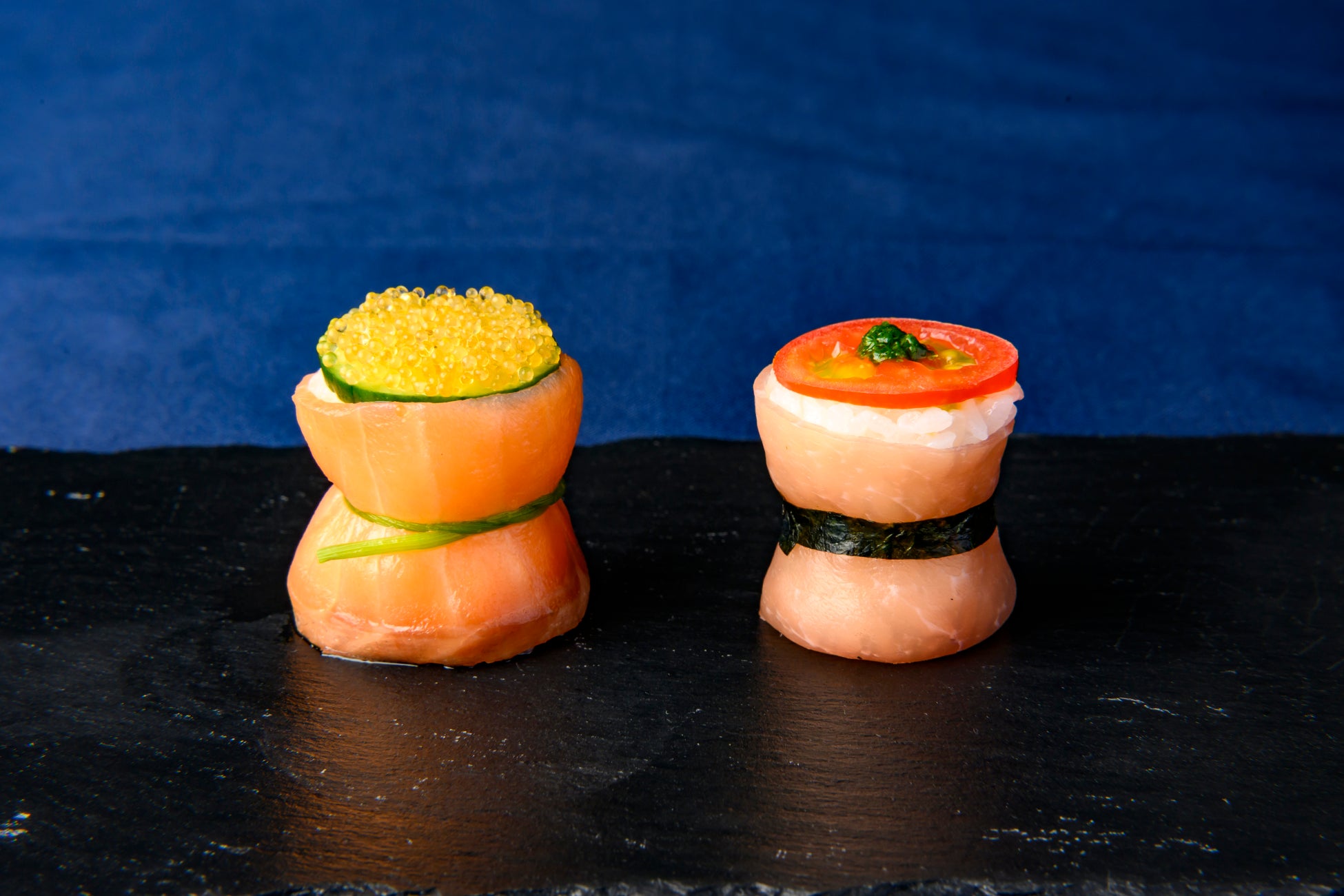 とびことサーモンマリネの鼓仕立て:脂の乗ったサーモンを軽くマリネし、爽やかな酸味で全体を引き締めました。とびこのぷちぷちと弾ける食感を活かし、金沢の伝統工芸「鼓」に模して視覚的な華やかさを演出したユニークな一貫。