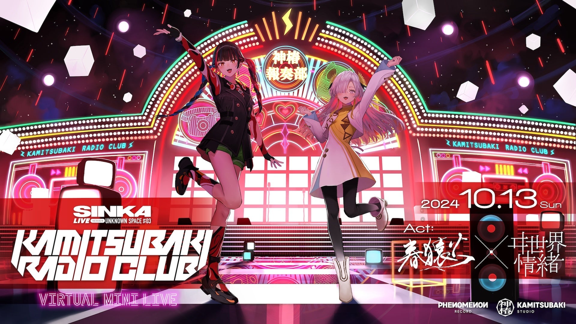 SINKA LIVE SERIES UNKNOWN SPACE 03「KAMITSUBAKI RADIO CLUB VIRTUAL MINI LIVE」と題されたこのライブは、配信開始から約4年となるYouToubeラジオ「神椿報奏部」のパーソナリティ二人によるVirtual mini live。ライブは春猿火のYouTubeチャンネルにて全編無料で配信予定です。息ぴったりな二人が織り成し奏でるライブは必見です。