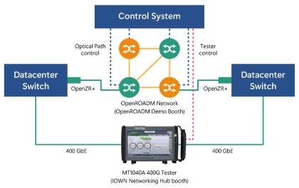 光ネットワークに対する柔軟性、拡張性、自律運用性などの要求が高まっており、統一された技術仕様の整備や複数ベンダーの機器による相互接続性といったオープン標準に基づくオールフォトニクスネットワーク(APN)の実現に向けて、開発と検証が進められています。本展示では、OpenROADM Demoブースに設置されたOpenROADM MSA[※2] 準拠のROADMネットワークとIOWN Networking Hubブースに設置されたデータセンタースイッチが、複数キャリアおよび複数ベンダーの連携により構築されています。さらに、このAPNシステムでは、OpenROADM YANGモデル[※3] や、データセンター装置の制御インタフェースであるOpenConfig[※4] YANGモデルを用いたコントロールシステムを実演しています。アンリツのMT1040Aはデータセンタースイッチに接続され、エンドツーエンドでの品質検証に利用されます。さらに、コントロールシステムにも接続され、OpenConfig YANGモデルを利用してAPNの通信品質をリアルタイムで検証するためにも活用されます。MT1040Aとコントロールシステムを連携させた検証により、複数キャリアおよび複数ベンダーで構築されるネットワークの効率的な検証やモニタリングを実現できます。これにより、データセンターオペレーターや通信オペレーターのAPNの導入と保守における運用の効率化に貢献します。