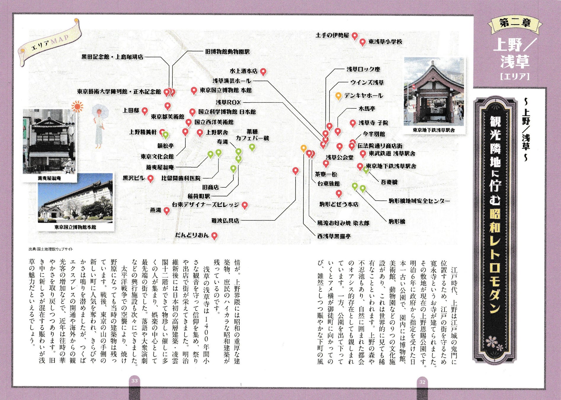 本書は、その「昭和の建物」を主役に、東京の街がどのように生まれ、変化してきたかを解き明かす、まったく新しい街歩きガイドです。下記の写真のように、上野や浅草、池袋などの街の中に点在する見ておきたい懐かしい建築物の建築場所、さらに写真でも紹介しています。
