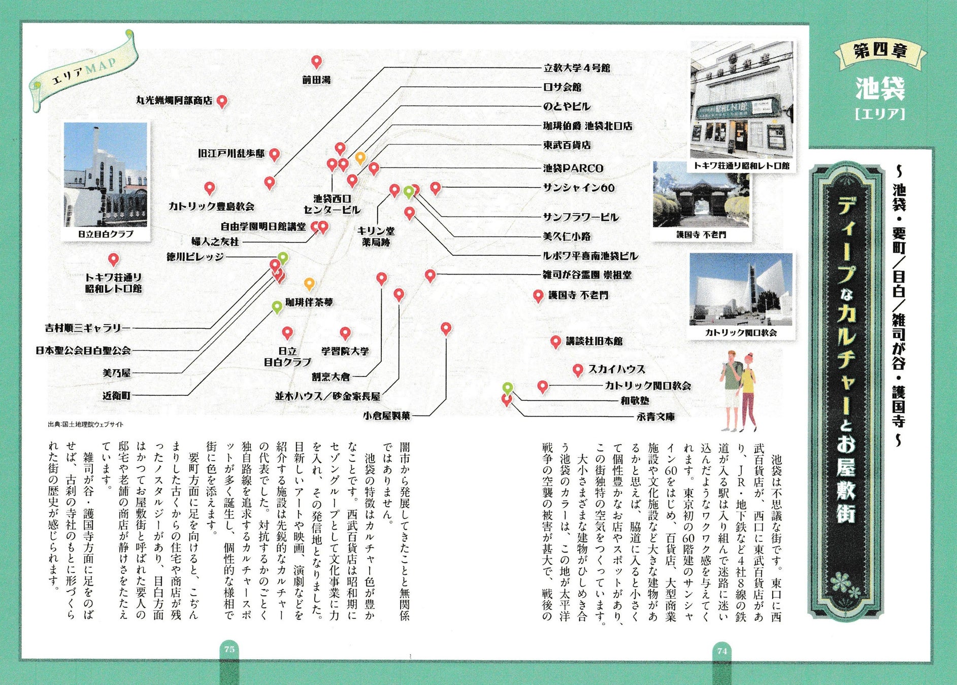 ◎サンシャイン60 ◎キリン堂薬局跡◎池袋PARCO◎サンフラワービル◎東武百貨店◎ロサ会館◎旧江戸川乱歩邸◎立教大学4号館◎自由学園明日館講堂◎婦人之友社◎のとやビル◎池袋西口センタービル◎ルボワ平喜屋南池袋ビル◎トキワ荘通り昭和レトロ館◎前田湯◎カトリック豊島教会◎丸光蝋燭阿部商店