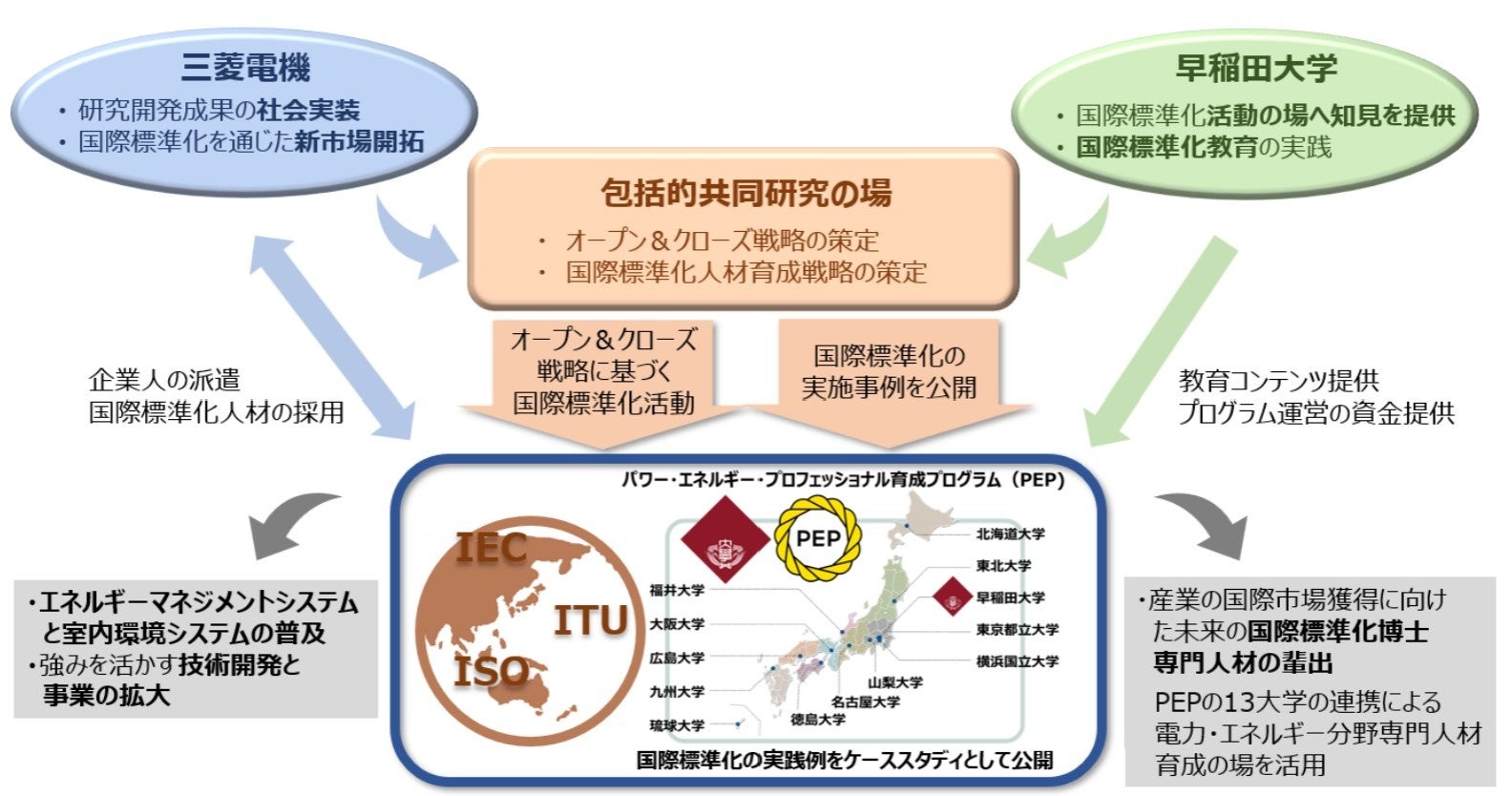 早稲田大学と三菱電機は、本計画認定の枠組みのもと、カーボンニュートラルとウェルビーイングの両立を見据え、エネルギーマネジメントシステムと室内環境システムの普及に向けたオープン&クローズ戦略の策定と推進に取り組み、電力事業者と需要家の双方に有益なシステム・機器の提案を実施します。また、産業の国際市場獲得に向けた未来の国際標準化博士専門人材の輩出を目指し、国際標準化の知見を活用した実践的な教育と、オープン&クローズ戦略に最適化させた実習教育を強化することにより、国際的に活躍できる人材の育成に取り組みます。
