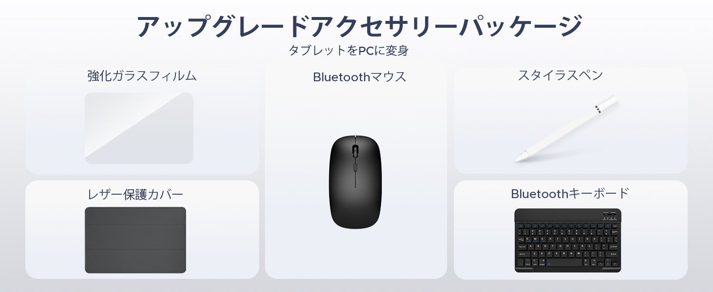 セット内容:タブレット本体、充電器、Type-Cケーブル、説明書、ケース、タッチペン、BTキーボード、BTマウス、保護フィルム