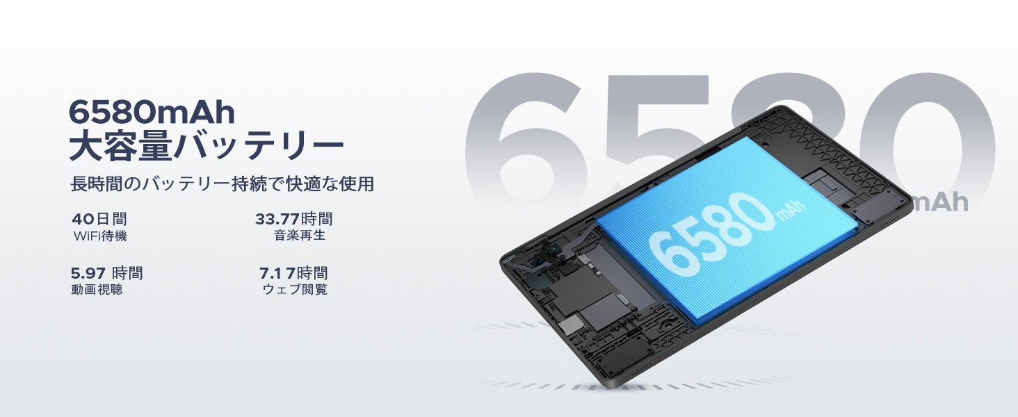 本体サイズは242.5×160.9×9.7mm、重さはわずか512gと持ち運びやすく、外出先でも快適に利用可能。大容量6580mAhバッテリーと省電力CPU(Unisoc T310)により、長時間駆動を実現しています。