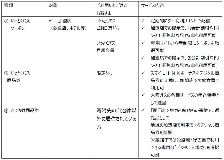 「いっとくパス」とは、大阪ガスが運営する、家庭用のお客さまと飲食店等をつなぐデジタルチケットサービスです。運用基盤として「e街プラットフォーム®」(運営:株式会社ギフティ)を活用しています。無料クーポンの配布やポイントによるデジタル商品券への交換等を通じて、加盟店で飲食等をお得に楽しんでいただけます。また、本デジタルインフラを活用し、現地消費型のふるさと納税である「関西おでかけ納税」およびその返礼品として地域の飲食店等で利用できる電子商品券「おでかけ商品券」も発行されています。