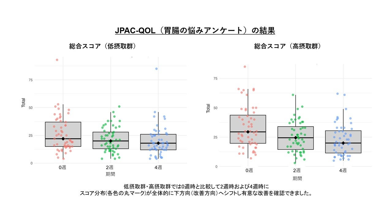 食物繊維の低摂取および高摂取グループでは2週間の摂取でJPAC-QOLスコアが有意に改善しました。また、排便のあった日数については、低摂取および高摂取グループともに4週間の摂取で有意に改善しました。