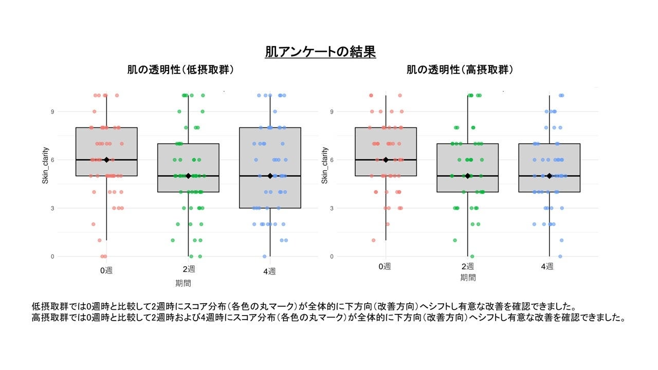 食物繊維の低摂取グループでは2週間の摂取にて肌の透明性が改善されたとの回答が有意に増加しました。また、高摂取グループでは2週間・4週間の摂取にて肌の透明性が改善されたとの回答が有意に増加しました。