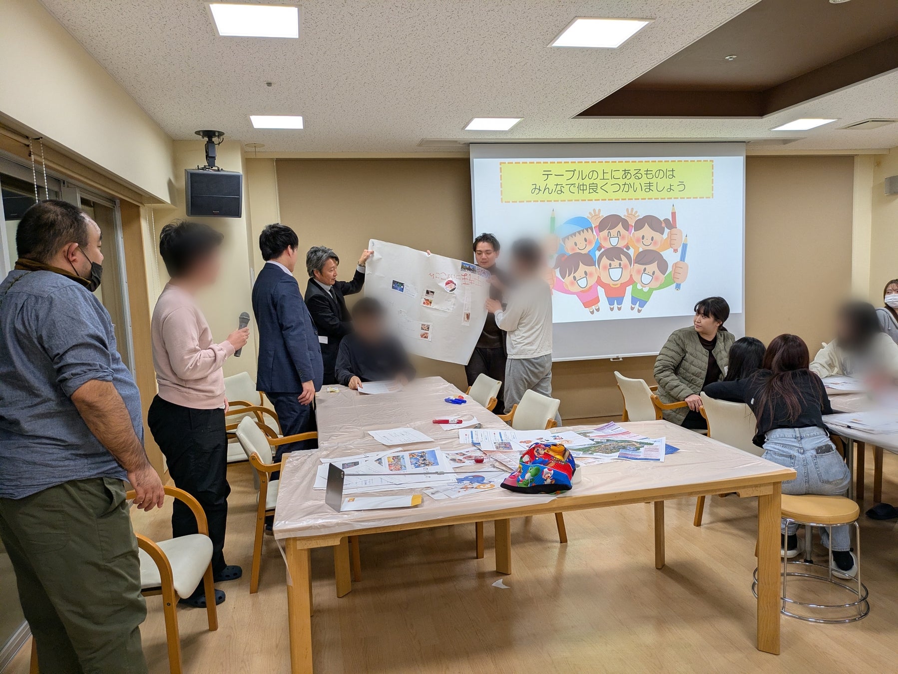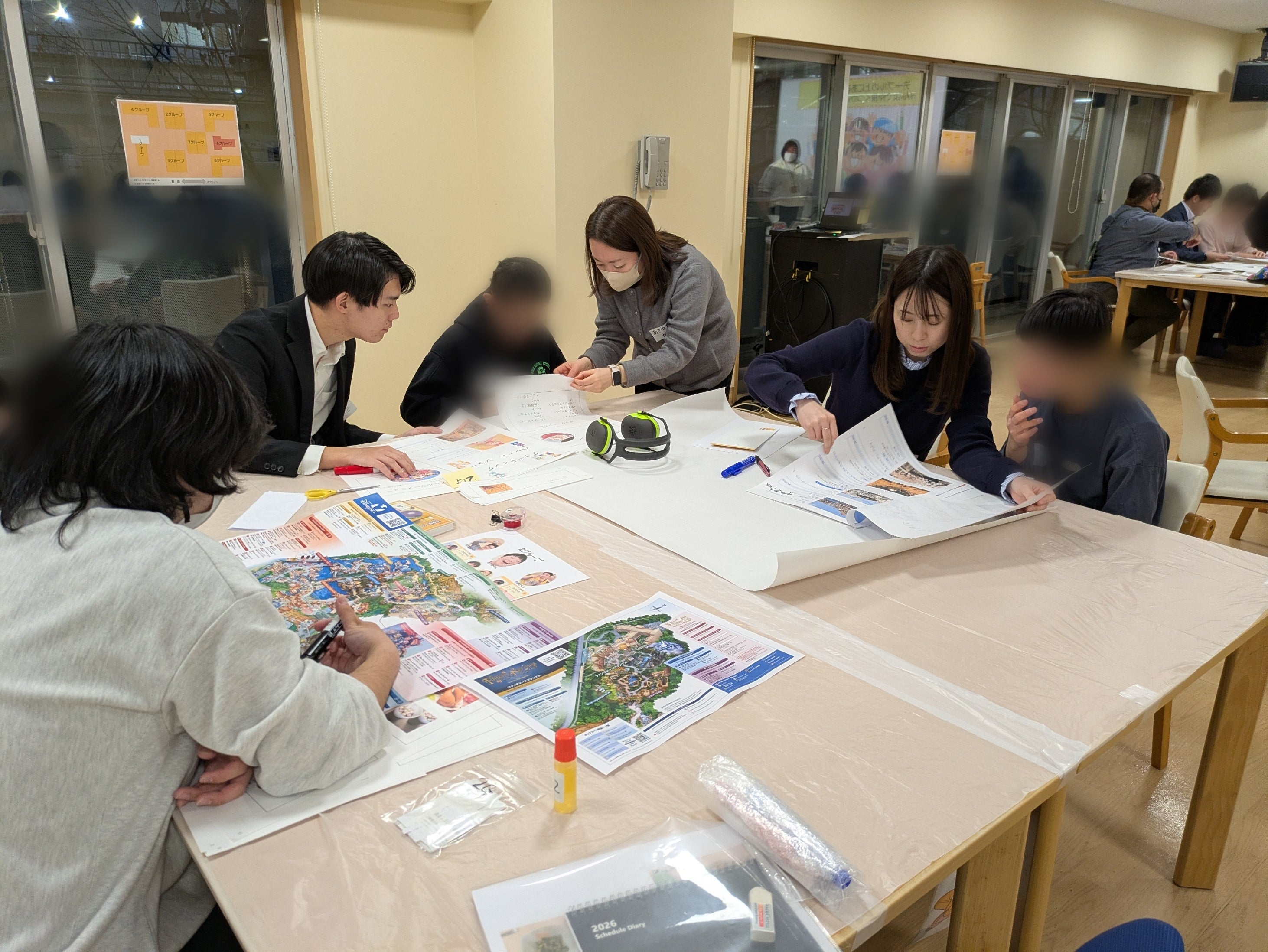 テーマパーク遠足に向けて、参加者全員が集まる事前交流会を実施しました。子どもたちが学校から帰ってくる夕方頃に、グループ(子ども2~4名、職員2名、社員1~2名)で夕食を囲みながら互いの顔を合わせ、テーマパークのアトラクションや食事の写真とマップを見ながら当日の計画を立て、子どもたちに発表してもらいました。そして同時に、当社社員は施設職員の方々とコミュニケーションを取りながら、子どもたちのアレルギーや食事サポートの方法などを確認しました。