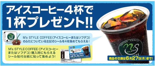 M’s STYLE COFFEE(アイスコーヒーまたはソフデコ)のふたについている左記のシール(ロゴマークシール)を4枚集めると、アイスコーヒーを1杯プレゼントいたします。