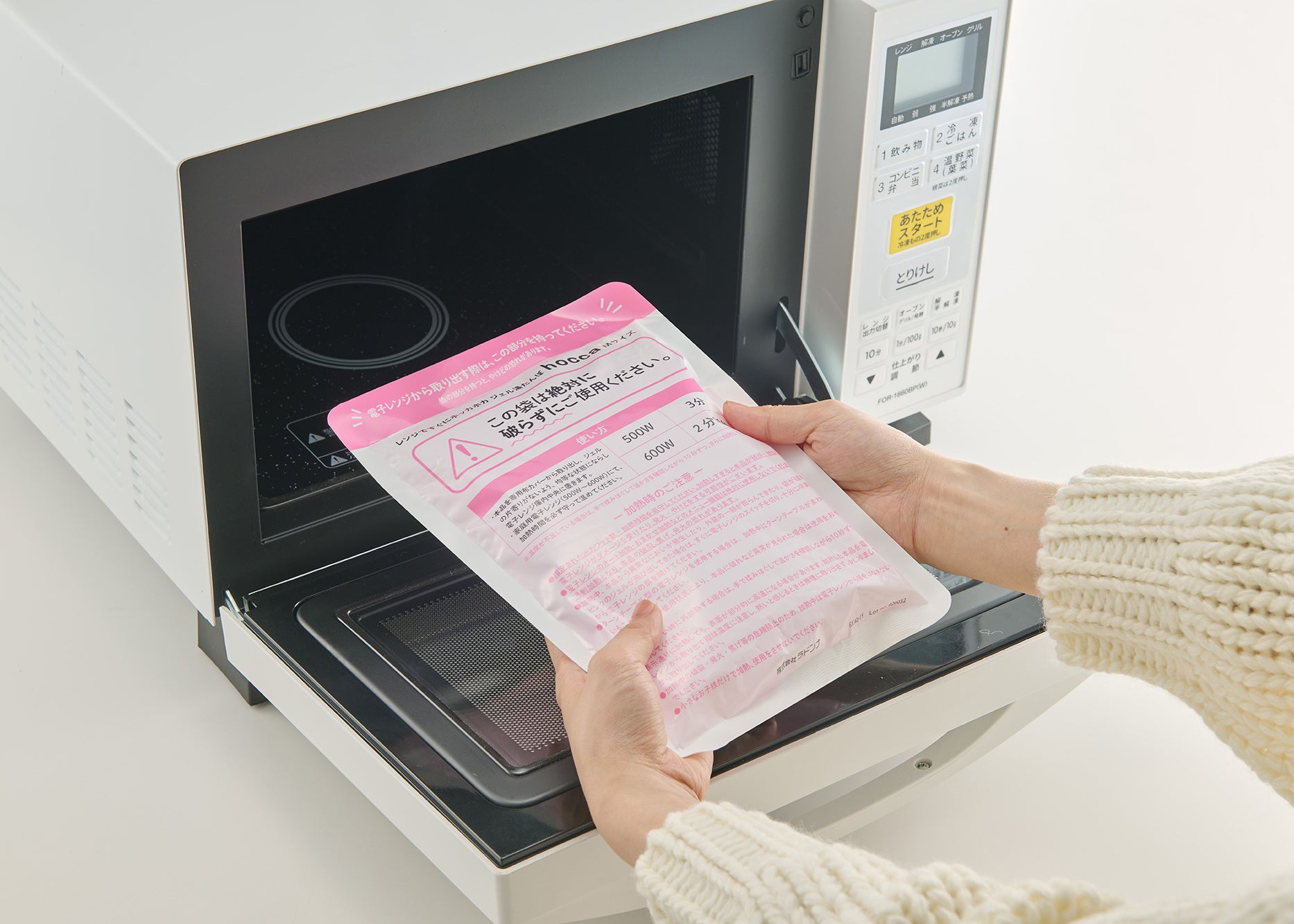 ※1:本品を専用布カバーから取り出し、V字型になるよう2つ折りにして家庭用電子レンジ500W/600Wで約15秒加熱。