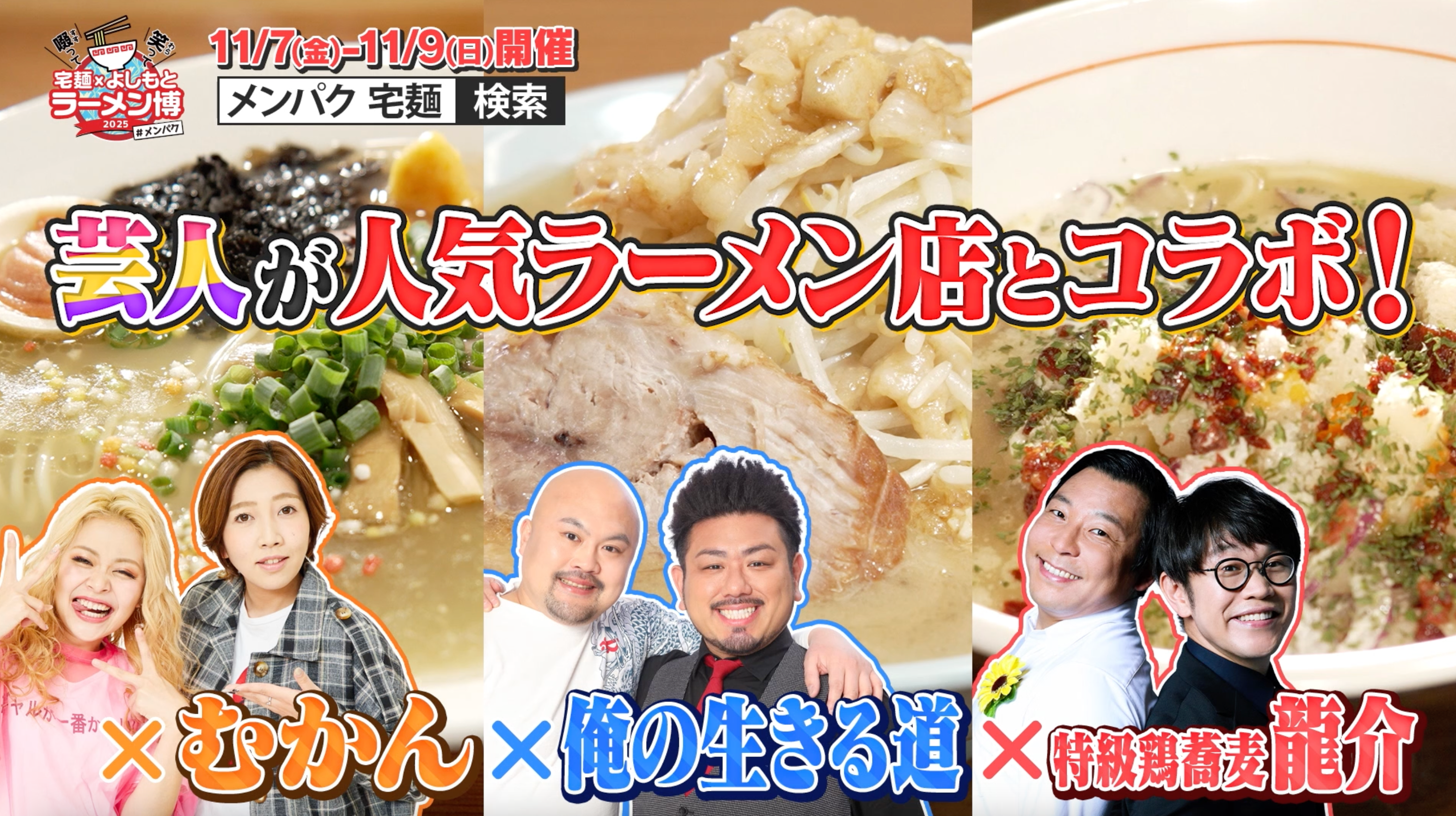国内最大級のラーメン専門通販サイト「宅麺.com」を運営するグルメエックス株式会社(本社:東京都港区、代表取締役社長:冨澤 文秀)は、吉本興業グループの株式会社FANY(本社:東京都新宿区、代表取締役社長:梁 弘一)と共同で、11月7日(金)よりラーメンイベント「啜って 笑って 宅麺 × よしもと ラーメン博 #メンパク」を開催します。日本が世界に誇るトップコンテンツの「ラーメン」と「お笑い」がタッグを組んだ、おいしくて笑える3日間です。
