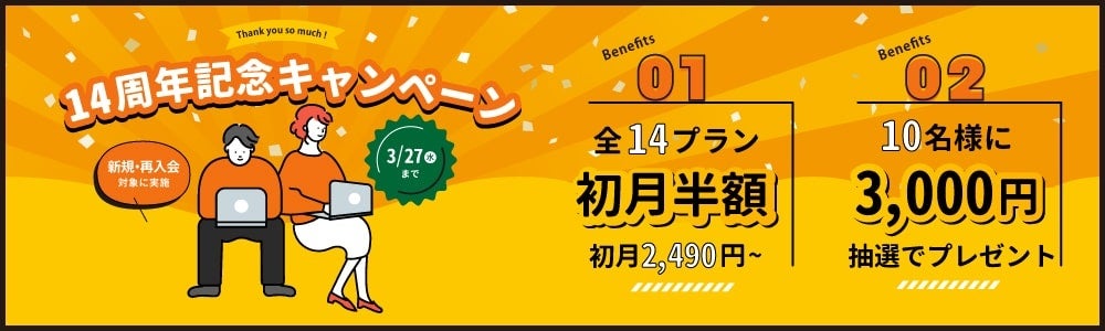 期間内に新規入会または再入会された方は、初月月額料金が半額(税込2,490円~)でご入会いただけます。