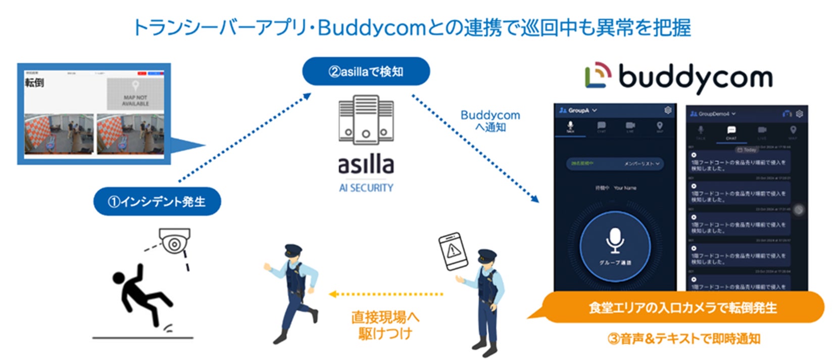 本連携ではasillaで検出した異常行動や不審行動をBuddycomを通じて従業員に対して通知することが出来ます。これまでasillaで検知された警備事案は、メールもしくは防災センター内にいる人にのみリアルタイム通知が可能でしたが、Buddycomとの連携により、Buddycomを利用する警備員やスタッフ個人へ直接、音声での一斉通知が可能になりました。これにより、事案発生場所に最も近いスタッフが迅速に対応できる体制が整い、通知を受信する場所の制約がなくなることで、より迅速な初動対応が可能となります。昨今の省人化により防災センターへの常駐のコストが高まる中、本連携を利用することでより柔軟な警備体制の構築を実現してまいります。