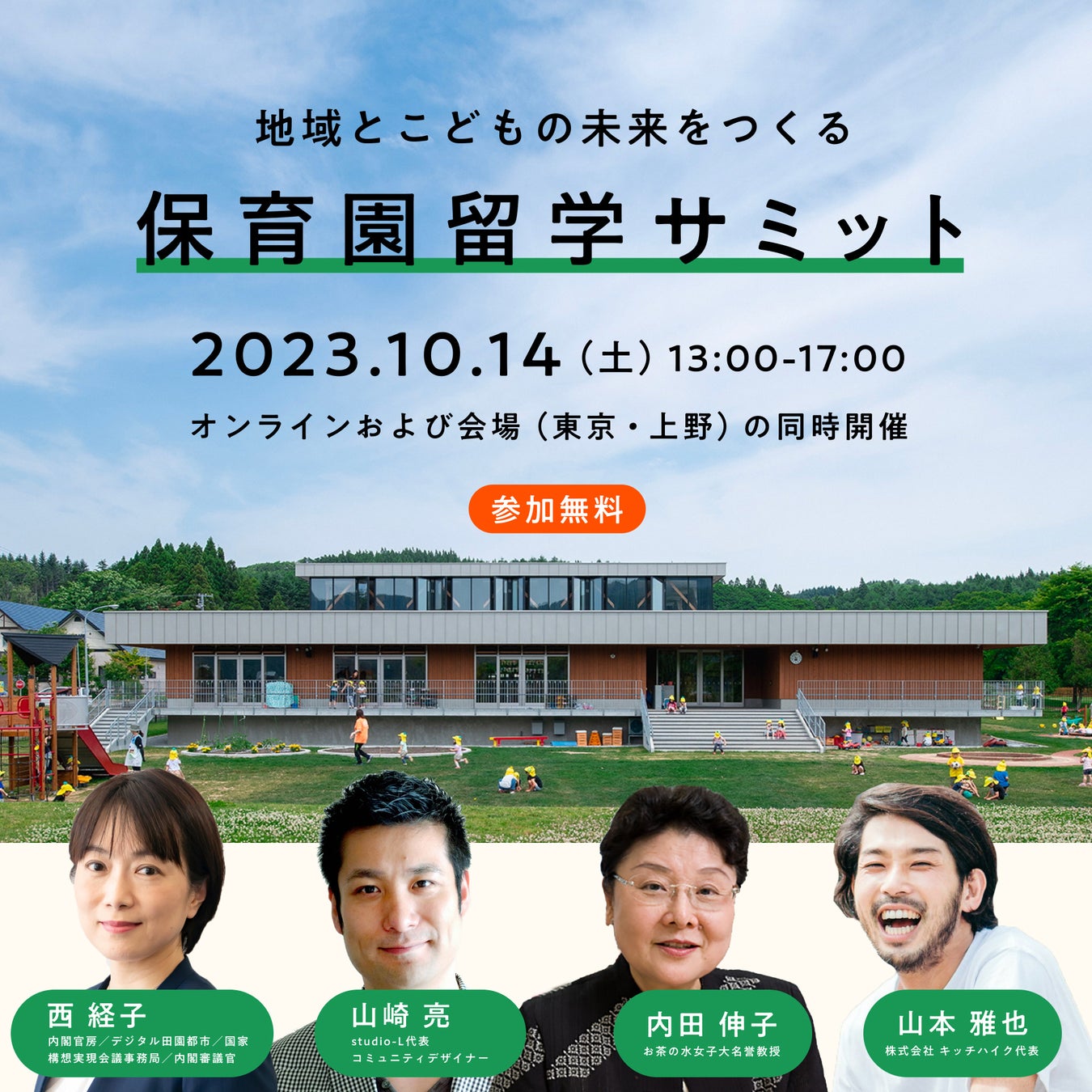 10/14(土)保育園留学サミット(東京上野オフィスリアル会場+オンライン配信)では、今回評価された実績を含めた取組みの最前線と合わせて、地域創生・子育ての未来について全国の関係者と議論・発信いたします。