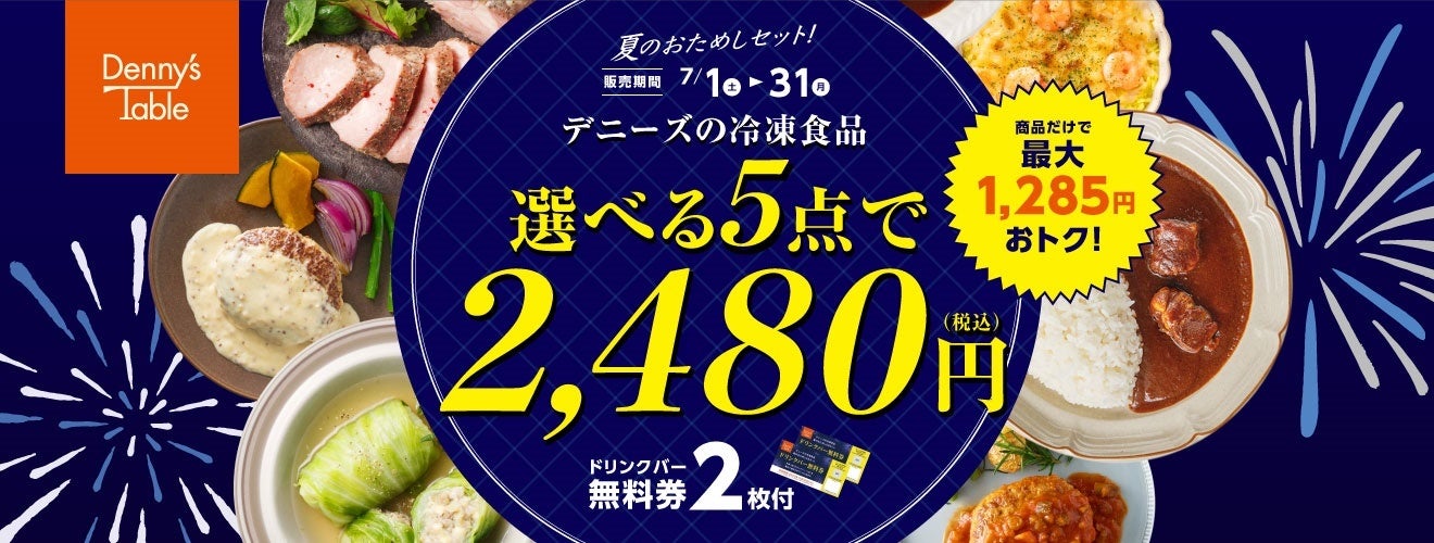 本企画商品は、人気の「お店のソースで仕込んだ デミグラスハンバーグ」や、「オマール香る海老ドリア~ターメリックライス」など対象11商品からお好きな5品と、さらにデニーズ店舗でご利用いただけるドリンクバー無料券2枚がついて税込2,480円と、商品だけで最大1,285円オトクなセットです。夏にぴったりな「スパイス香る!野菜を楽しむ キーマカレードリア」や「欧風ビーフカレー」、暑い日でも電子レンジで簡単調理ができる「北海道産3種チーズの海老グラタン」も対象商品となっております。