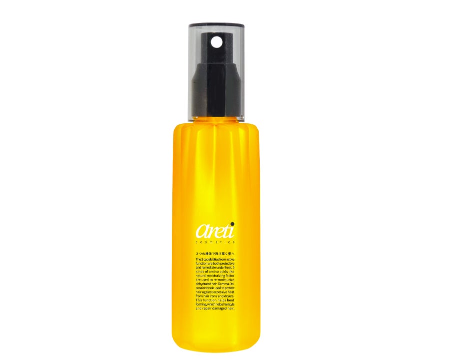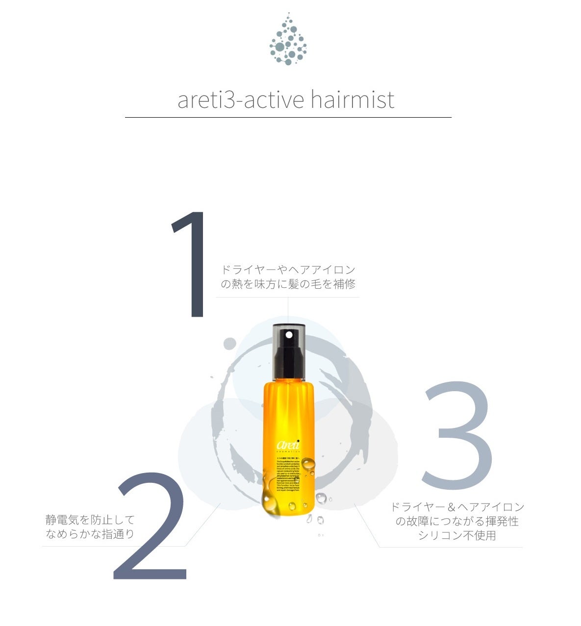 アレティのトライアクティブヘアミスト(m1608)はドライヤーやヘアアイロンの熱と結合することで乱れたキューティクルを補修し、余分な水分を吸収させない洗い流さないトリートメントです。スタイリングを記憶する作用もあり、ダメージヘアでも使うほど扱いやすくなるメリットも。