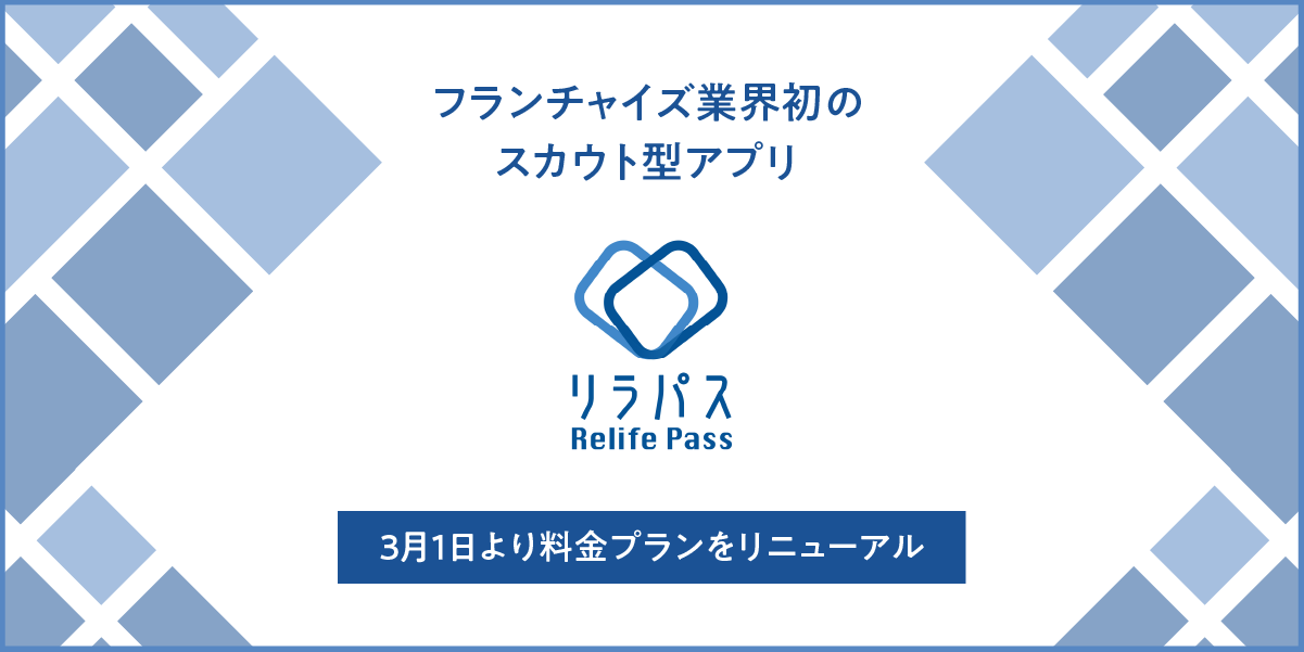 昨年7月、「フランチャイズ比較.net」は、ユーザー集客・加盟獲得にお悩みのフランチャイズ・代理店企業様が開業・副業を検討中の方やフランチャイズ制度を利用し独立開業をしたい方へ向け直接オファーを送れるスカウトアプリ「RelifePass(リラパス)」を新たにリリースいたしました(※プレスリリース:https://prtimes.jp/main/html/rd/p/000000159.000008966.html)。業界初のスカウト型マッチングモデルにより、フランチャイズ・代理店企業様の加盟ユーザー確保・領域拡大をサポートします。
