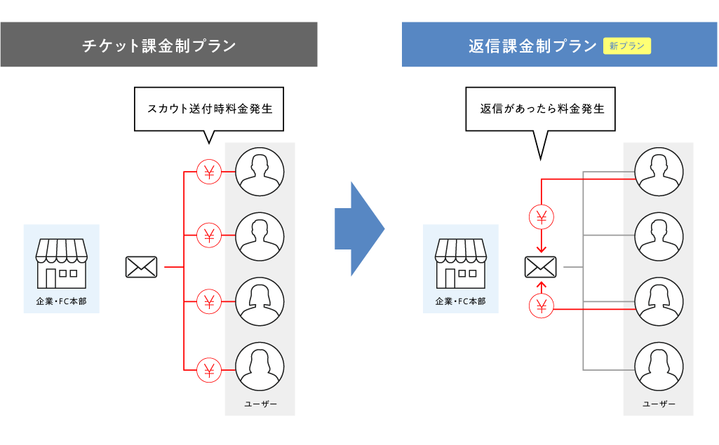 この度リラパスは、スカウト送付数をベースとした従来の「チケット課金制プラン」を改訂し、新たに「返信課金制プラン」をリリースいたしました。