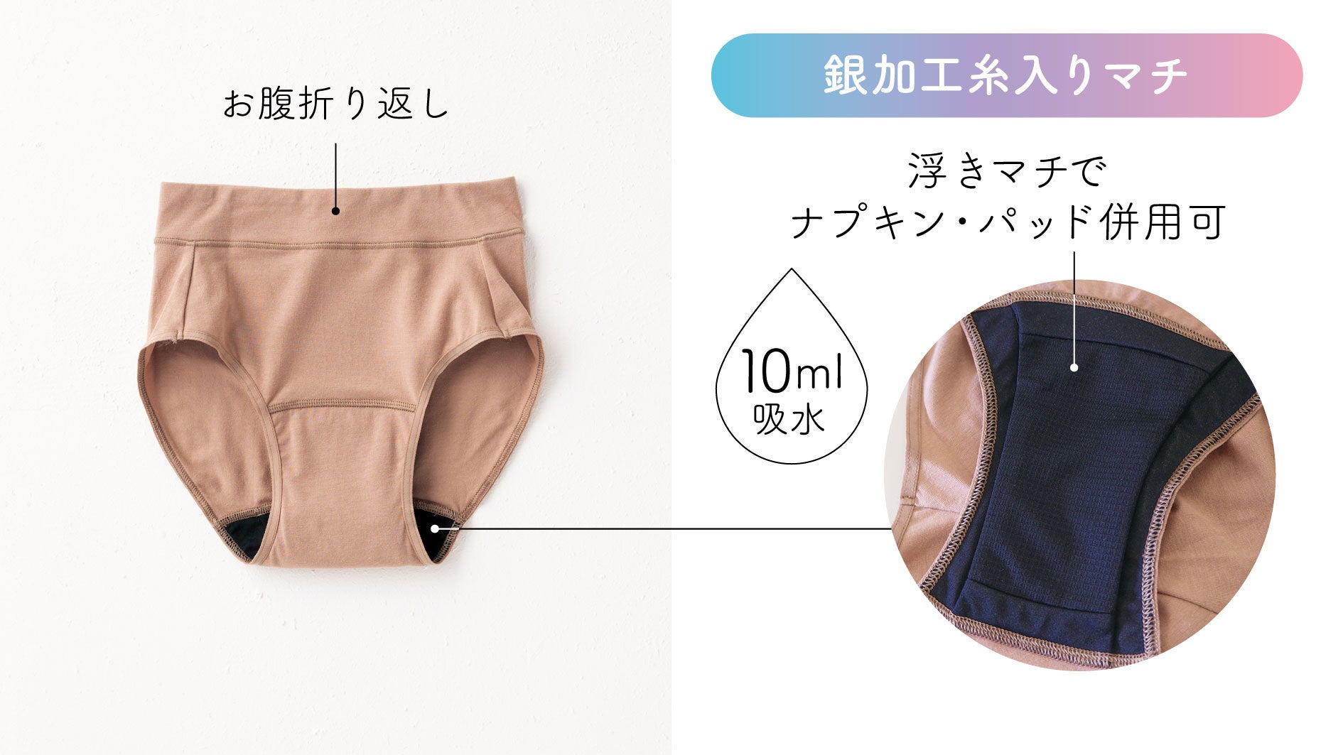 10mlの吸水機能があるマチ部分に銀加工糸を使用し抗菌防臭効果を持たせました。浮きマチ仕様なので、羽つきナプキンや吸水パッドとの併用も可能です。お腹部分はくい込みにくい折り返し仕様です。