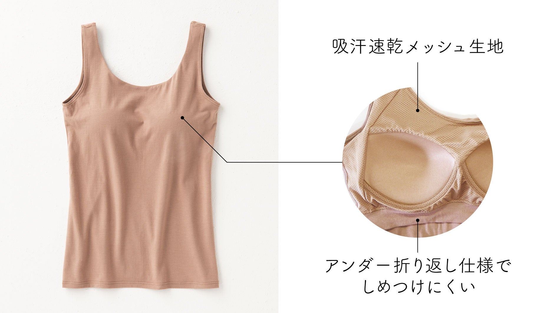 カップのアンダー部分が折り返し仕様のため、しめつけにくく楽な着心地です。肩からカップの周辺部にかけて吸汗速乾機能を持ったメッシュ生地を使用しています。汗をかいてもすぐに乾き、さらっとした肌触りで快適です。