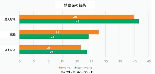 ハイブリッドな労働環境であるかどうかに関係なく、労働者の幸福度は低く、燃え尽き度の上昇を訴えています。