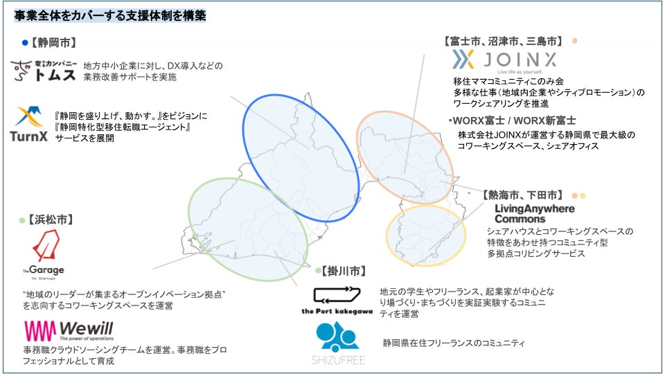 静岡県民が年齢・性別に関わらず自身のスキルやニーズに合った働き方を自由に選択できる環境づくりや、地域内での仕事創出と獲得機会が循環する仕組みをつくることで、持続可能な体制を目指してまいります。主に取り組む内容を以下にてご紹介いたします。