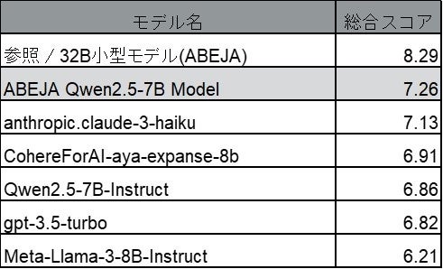 このたびABEJAは、本プロジェクトの一環である10B以下の小型モデルの開発に関して、汎用的言語性能を図る指標であるMT-Benchで、同規模のモデルにおける最高水準かつOpenAIの「GPT-3.5 Turbo」などを超える精度に到達した、7Bの小型モデル「ABEJA Qwen2.5-7B Model」を構築いたしました。