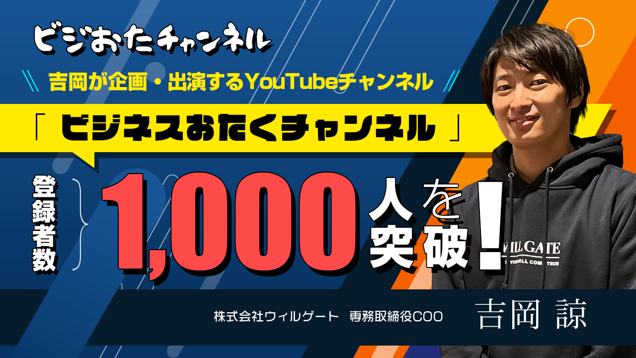 株式会社ウィルゲート(本社:東京都港区、代表取締役CEO:小島 梨揮、以下 ウィルゲート)の専務取締役COOかつ共同創業者である吉岡 諒が企画・出演する「今すぐ真似したくなる」ビジネスに役立つ情報を届けるYouTubeチャンネル、「ビジネスおたくチャンネル」のチャンネル登録者数が1,000人を突破しました。