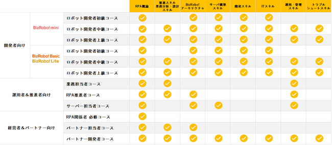 BizRobo!の開発・運用・推進に必要なスキルを体系化し、RPAプロジェクト担当者の役割に応じて必要なスキルを抽出して学べるコース設定を行いました。