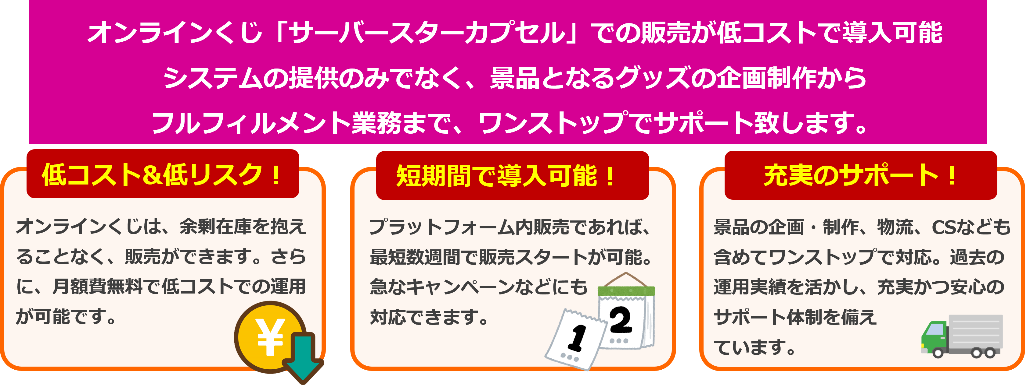 当社は、サイバースターカプセルの導入を検討されている企業様のお問合せをお待ちしております。導入したいけれど、どのような景品にしたら良いか、どこで作ったら良いか分からない、配送はどのようにしたら等についても当社が一気通貫でサポートいたします。